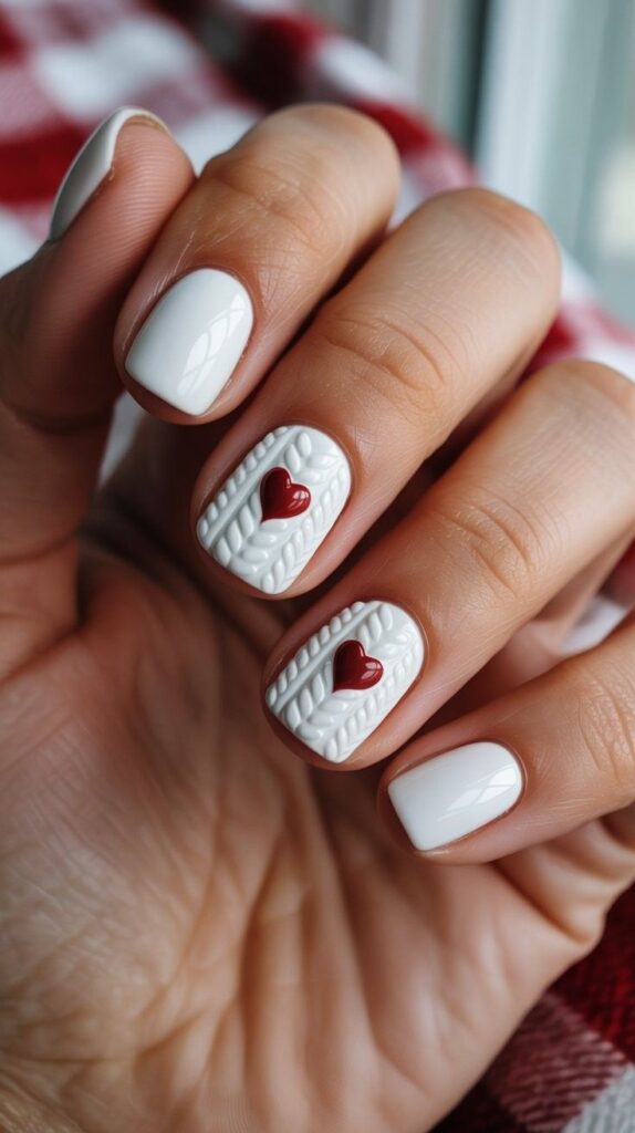 “Soft white polish gets a holiday upgrade with delicate knit-stitch designs on two accent nails — each featuring a tiny red heart at the center. It’s subtle, serene, and perfect for pairing with chunky knits or denim jackets.”
