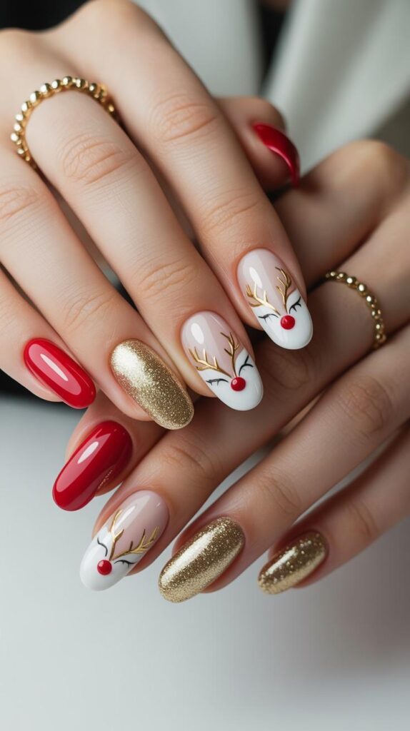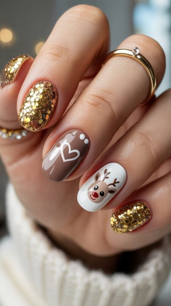 “Rich gold glitter coats two accent nails like holiday confetti, while the ring finger steals the show with a sweet reindeer face — complete with antlers and a red nose. Another nail features a tiny white heart — playful, cozy, and totally wearable.”