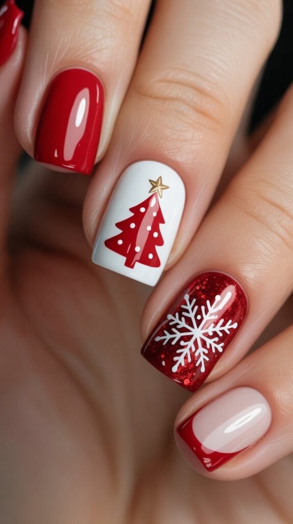 “Crisp white polish frames a bold red Christmas tree topped with a gold star on one nail, while another features a giant white snowflake on a glittery red base. The remaining nails? Glossy red tips for that classic holiday pop — sweet, serene, and totally wearable.”