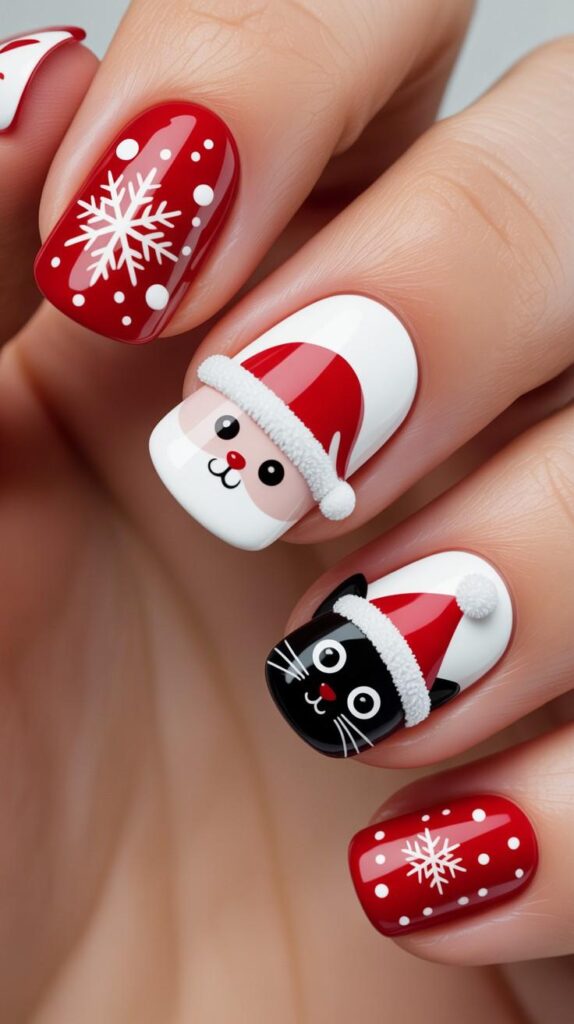 “Bold red polish frames giant white snowflakes on four nails, while the ring finger steals the show with a cute Santa cat face — complete with a fluffy beard and rosy cheeks. Another nail features a glossy black kitty wearing a Santa hat — playful, whimsical, and totally Instagram-worthy.”