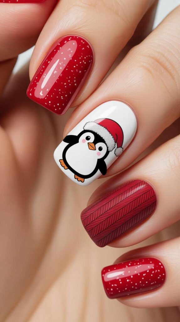 “Vibrant red glitter sets the stage for a whimsical penguin face on one nail — complete with a pointy Santa hat and rosy cheeks. The rest? Sprinkled with snowflakes and herringbone stripes — like a mini Christmas village living on your fingertips.”