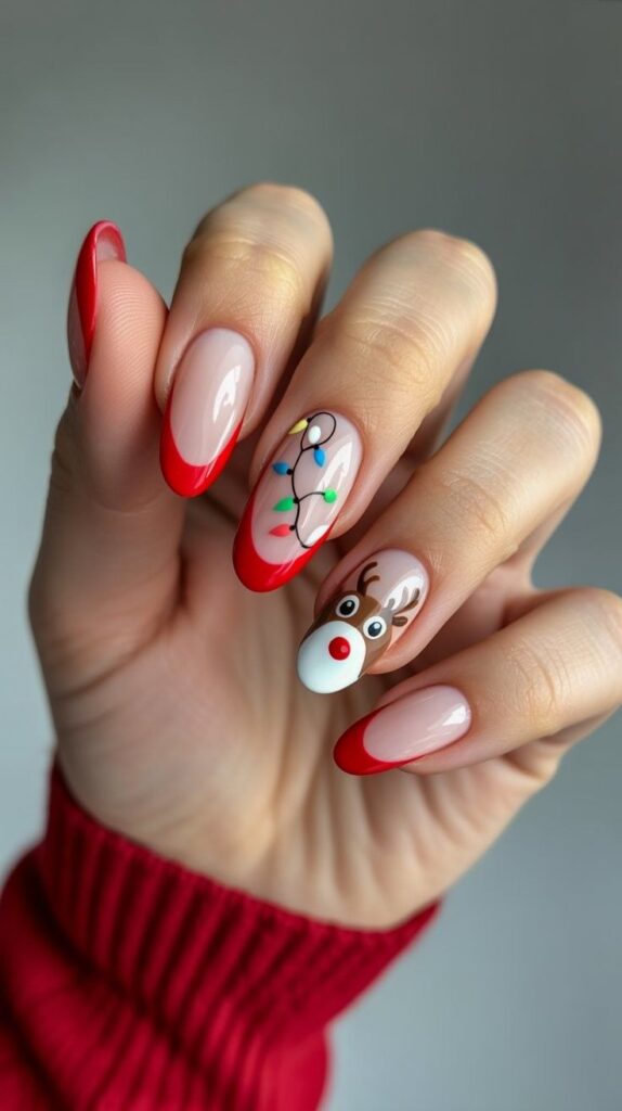 “Soft nude polish frames crisp red glitter tips on four nails, while the ring finger steals the show with a hand-painted reindeer (complete with big eyes and an orange nose). Another nail features a tiny red bow — charming, not childish.”