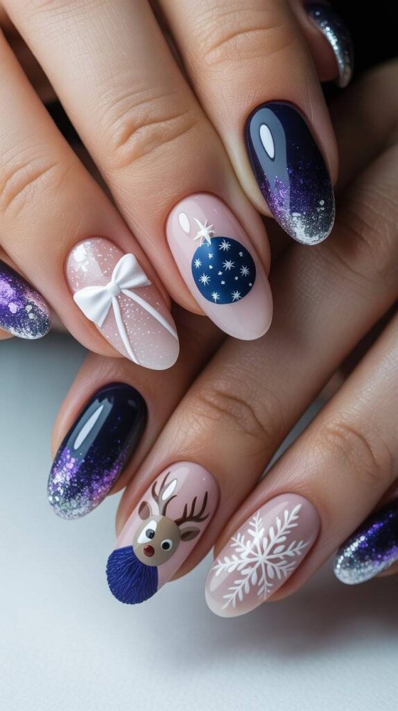 “Glossy nude nails meet luxury with a shimmering holographic glitter accent nail and delicate white bow designs that look like they’ve been tied onto the surface. One nail features a giant blue ornament with white stars, another a reindeer with a fluffy blue scarf — elegant, whimsical, and totally photo-ready.”