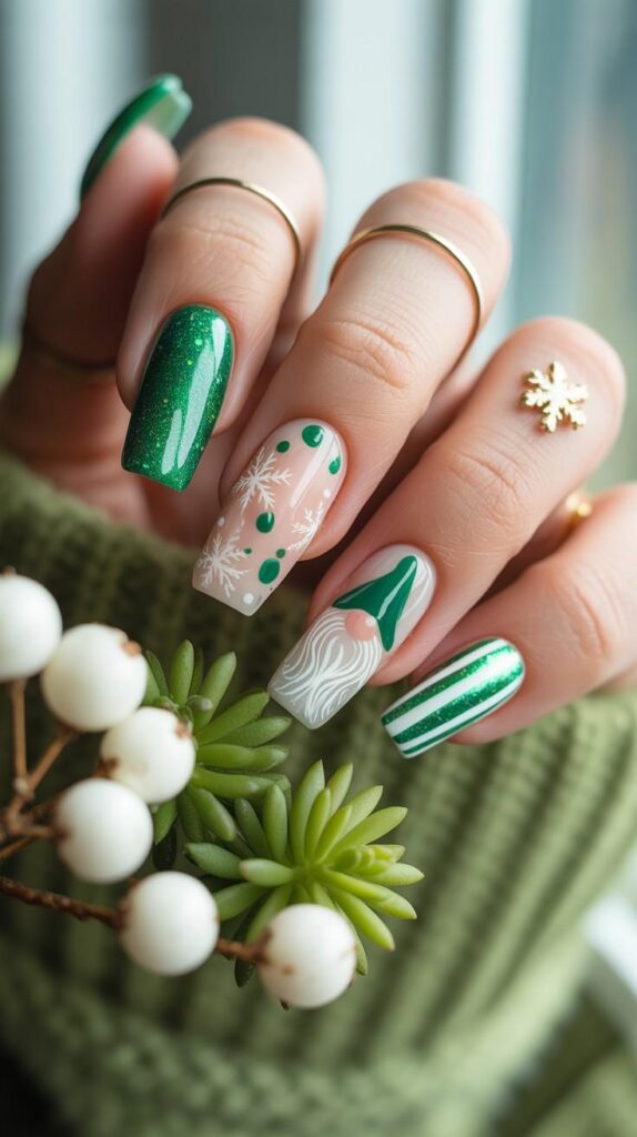 “Vibrant green glitter sets the stage for a whimsical gnome face on one nail — complete with a pointy hat and rosy cheeks. The rest? Sprinkled with snowflakes, stripes, and polka dots — like a mini Christmas village living on your fingertips.”