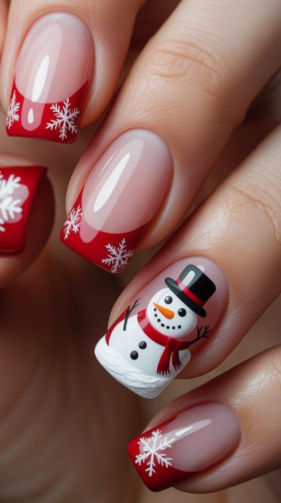 “Soft nude polish frames crisp red tips on four nails, while the ring finger steals the show with a hand-painted snowman — complete with a top hat, carrot nose, and red scarf. Tiny white dots scattered around mimic falling snow — charming, not childish.”