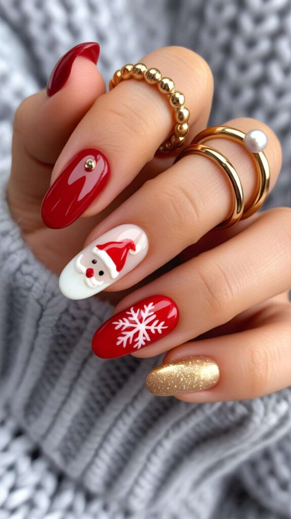 “Bold red polish frames giant white snowflakes on four nails, while the ring finger steals the show with a 3D Santa face — complete with fluffy beard and rosy cheeks. Another nail features a glossy red-and-white candy cane stripe — classic, cozy, and totally Instagram-worthy.”