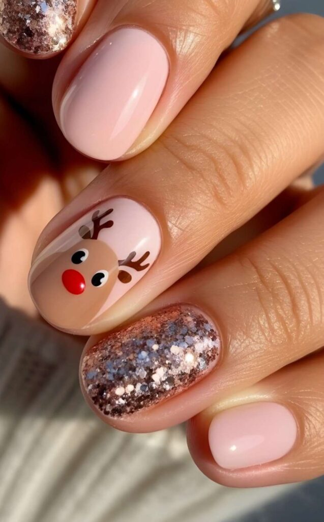 “Soft blush pink polish gets a playful upgrade with a hand-painted reindeer (complete with big eyes and an orange nose) on one finger, and a galaxy glitter accent nail on another. It’s dreamy, ethereal, and totally unexpected — like looking up at the stars while standing under a snowy forest.”