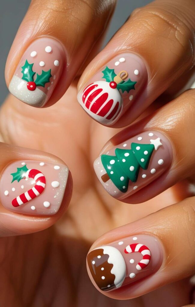 “Soft blush pink polish frames four accent nails — one with a glossy red-and-white candy cane, another with a green Christmas tree topped with a star, and a third with a gingerbread man dripping with white icing. Tiny white dots scattered around mimic falling snow — playful, nostalgic, and packed with charm.”