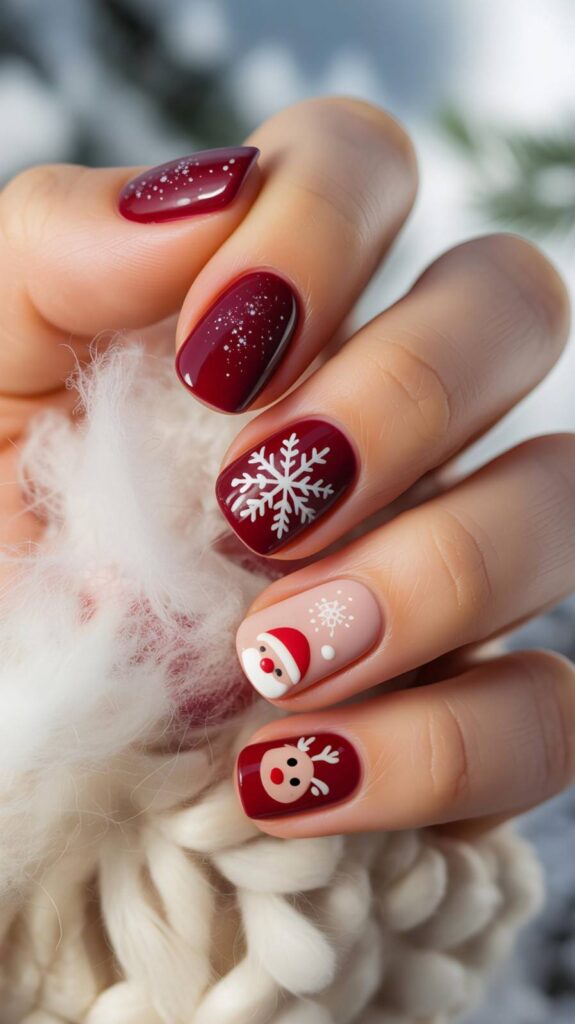 “Rich red glitter coats two accent nails like holiday confetti, while the ring finger steals the show with a sweet reindeer face — complete with antlers and a red nose. Another nail features a tiny white snowflake — playful, cozy, and totally wearable.”