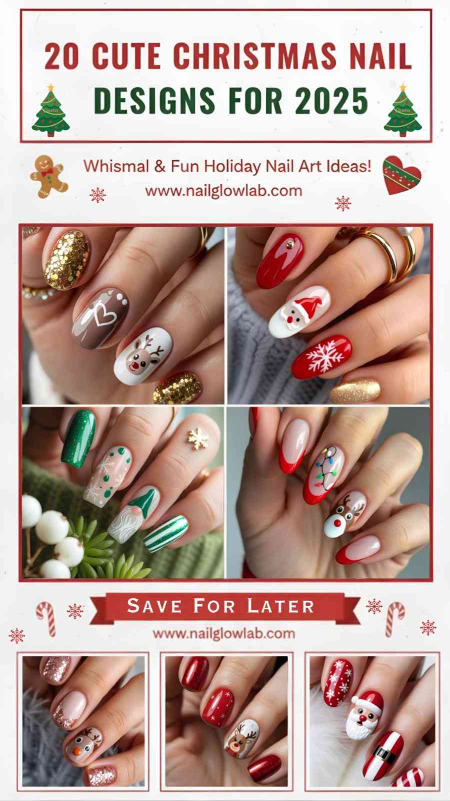 There you go — 20 ways to wear Christmas cuteness without ever feeling too flashy, too busy, or too “been there.” Whether you’re team matte or glossy, minimalist or full-on glam, there’s a design here that’ll match your vibe — and your sweater. Save your fave, screenshot the steps, or take the whole collage straight to your nail tech. ✨And if you’re already dreaming of January? Swing by NailGlowLab.com — we drop fresh designs every week.Which number are you wearing first? Drop it below — and let the holiday compliment-counting begin. 🎄💅