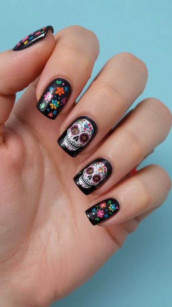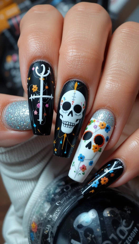 A dramatic black base frames intricate sugar skulls painted in white, adorned with tiny flowers in orange, blue, and pink. One nail features a delicate white cross with trailing vines — a nod to tradition, while glittery silver tips add modern sparkle. It’s bold, beautiful, and full of cultural heart.