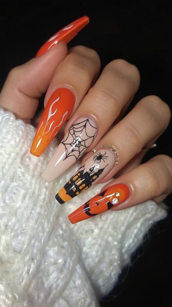 15) Halloween Meets Dia de los Muertos – Orange Flame & Spiderweb Nails