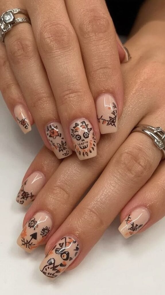 Soft nude nails are subtly decorated with delicate black line art — tiny sugar skulls, vines, and marigolds sketched with precision. One nail features a small “Amor” script — a quiet, personal tribute that feels like a secret love letter to loved ones.