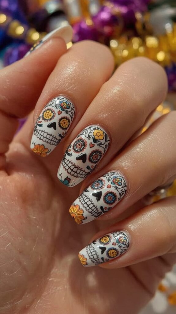 Glossy white nails are covered in repeating sugar skull motifs — each face uniquely decorated with flowers, hearts, and swirls in warm oranges, blues, and pinks. It’s playful yet respectful, like a joyful parade of memories dancing across your fingertips.