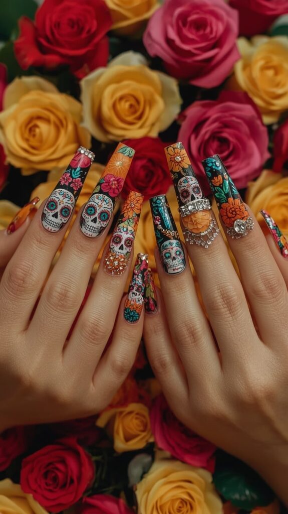 Long coffin nails feature intricate sugar skulls painted in vivid colors, surrounded by blooming roses in red, pink, and gold — some nails even hold tiny crystal charms. Set against a backdrop of real roses, this look is luxurious, romantic, and deeply honoring.