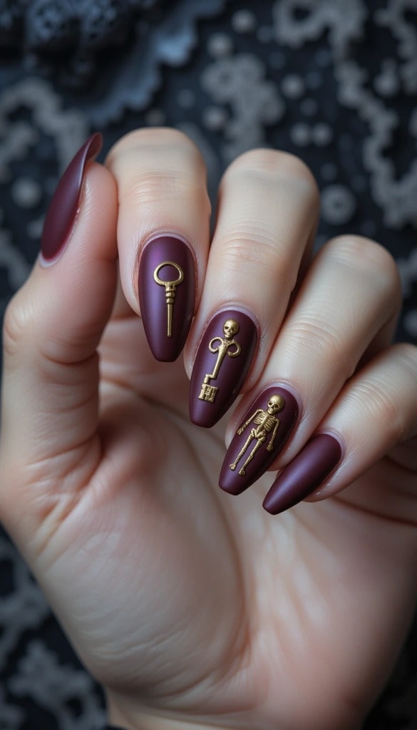 8) Burgundy Matte Nails with Gold Skeleton & Key Accents