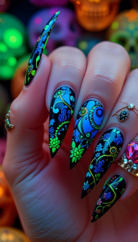 16) Neon Glow Sugar Skulls on Black Stiletto Nails