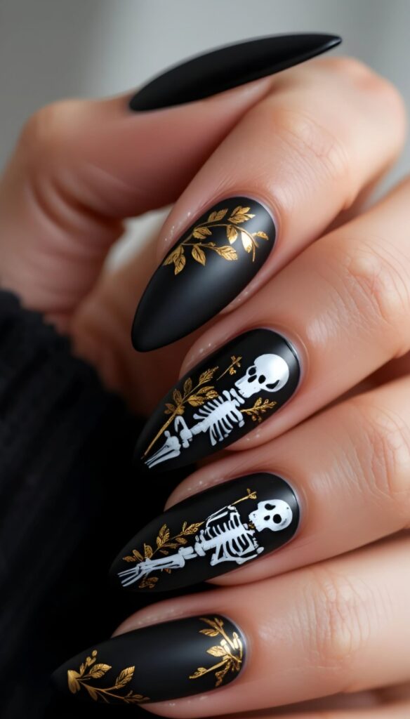 Sleek matte black nails host delicate white skeletons intertwined with shimmering gold leaf branches — elegant, haunting, and quietly luxurious. The coffin shape adds drama, while the metallic contrast brings reverence and refinement. It’s not spooky — it’s sacred.