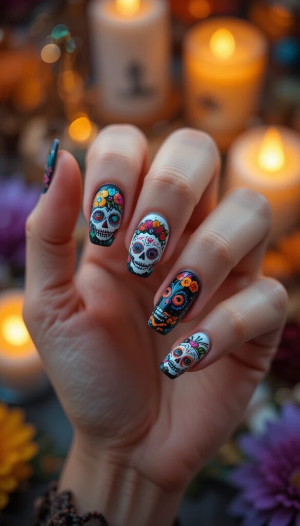 Set against a warm, glowing backdrop of candles and marigolds, these nails feature sugar skulls crowned with bright blooms — each face uniquely decorated in vivid hues. The dark teal and white bases make the colors sing, while the soft lighting adds a dreamy, reverent mood.