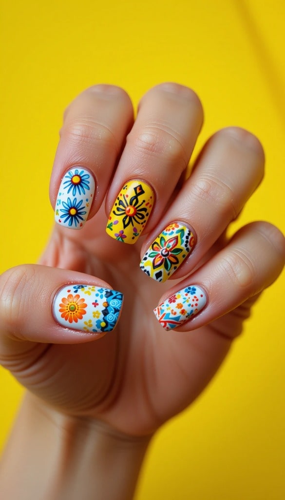 Sunshine-yellow and crisp-white nails bloom with hand-painted flowers — daisies, marigolds, and geometric blooms in rainbow hues. The glossy finish enhances the joy, while the cheerful palette makes this look feel like a celebration of life, light, and memory.