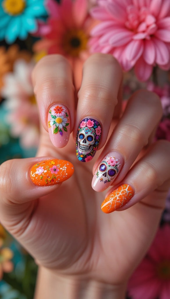 A joyful mix of orange, pink, and white nails bloom with hand-painted flowers — daisies, roses, and marigolds — surrounding one bold sugar skull that steals the show. The glossy finish enhances the vibrancy, making this look feel like a garden party for the soul.