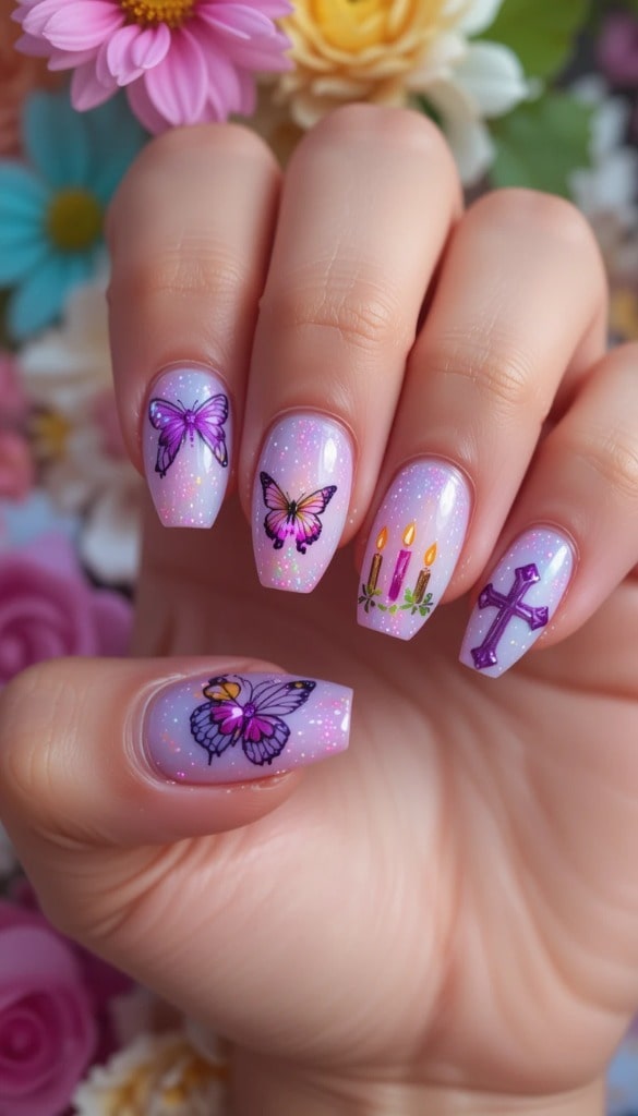 11) Glittery Lavender Nails with Butterflies, Candles & Cross