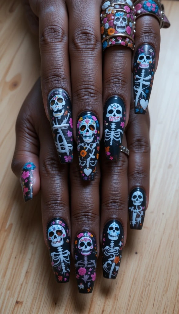 Rich black nails host white skeletons and sugar skulls decorated with colorful flowers and hearts — designed to pop beautifully against deeper skin tones. The glossy finish enhances contrast, while the playful details make this look feel joyful, proud, and culturally radiant.