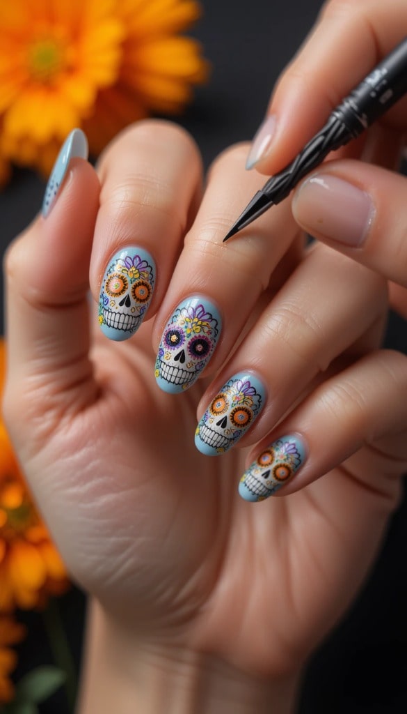 Soft sky-blue nails cradle delicate sugar skulls painted in vibrant floral patterns — think daisies, roses, and marigolds blooming across their faces. The light base makes the colors pop, while the glossy finish adds a dreamy, ethereal glow — perfect for those who love tradition with a gentle touch.