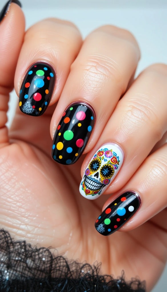 Playful rainbow polka dots dance across glossy black nails, with one standout accent nail featuring a colorful sugar skull bursting with floral details. The contrast is joyful, festive, and totally eye-catching — perfect for those who love tradition with a pop of fun.