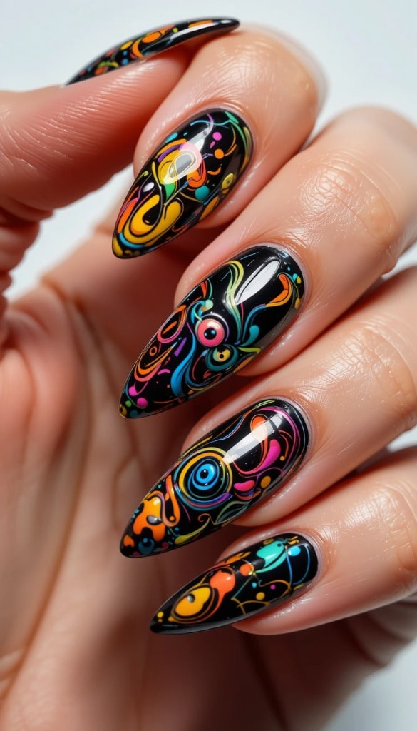 Black nails become a canvas for swirling, psychedelic sugar skull patterns — vibrant oranges, blues, pinks, and yellows dancing in chaotic harmony. It’s modern, artistic, and full of movement — like a mural painted on your fingertips, celebrating life through color.