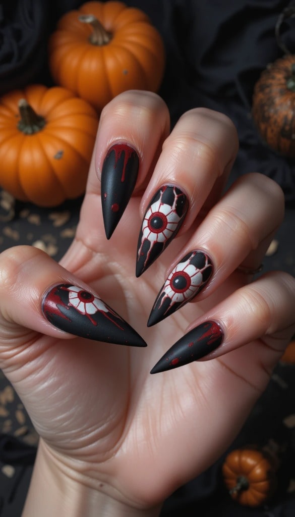 12) Blood-Drip Eyes on Black Stiletto Nails