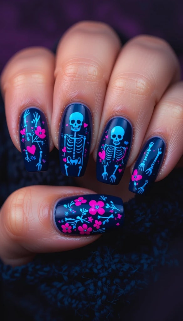 Deep navy blue nails glow with electric blue skeletons and hot pink flowers — a bold, modern twist on tradition. Tiny hearts and vines add sweetness, while the high-contrast colors make this look impossible to ignore. It’s not spooky — it’s celebratory.