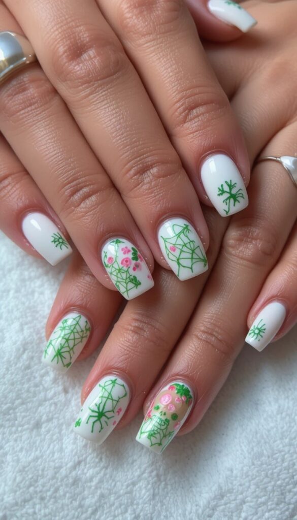 Crisp white nails bloom with hand-painted green spiderwebs, tiny pink blossoms, and delicate floral vines — a fresh, modern twist on tradition. The clean base lets the colors sing, while the soft details make this look feel sweet, serene, and perfectly seasonal.