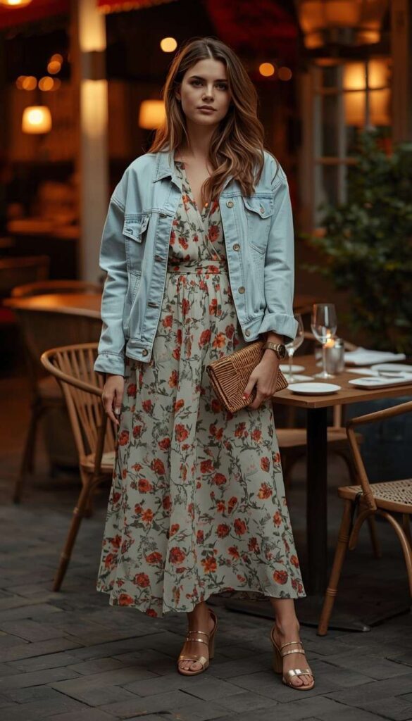 15) Denim Jacket Over Floral Midi Dress