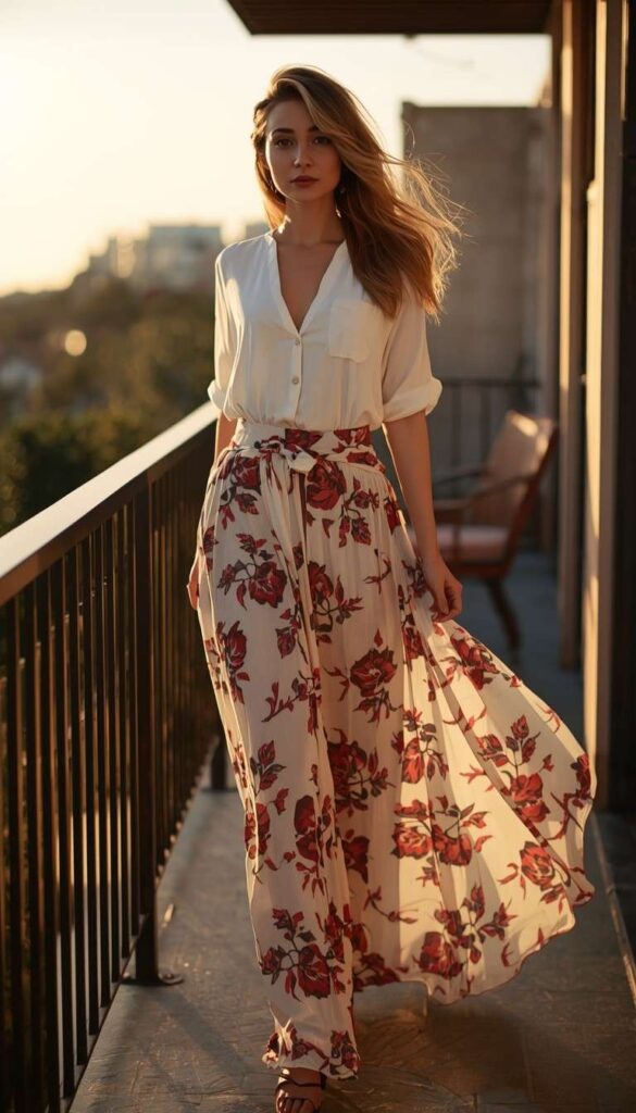 A flowing ivory maxi dress in lightweight silk-crepe, adorned with bold red-and-black rose print, cinched at the waist with a self-tie belt. Paired with tan leather slide sandals and a woven raffia tote. The model walks along a sun-drenched balcony—wind lifting the hem, city skyline blurred behind her. The silhouette is romantic, modern, and deeply wearable—dinner as celebration.