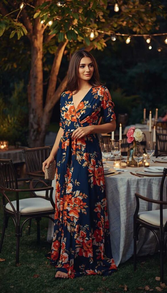 A floor-length navy chiffon maxi dress adorned with vibrant orange-and-cream floral print, V-neckline, and a self-tie waist belt. Paired with a textured gold clutch and nude strappy heels. The model stands beside a beautifully set outdoor table—candles flickering, string lights glowing above, greenery framing her. The fabric flows like water, and the look radiates warmth, romance, and joyful sophistication—dinner as celebration.