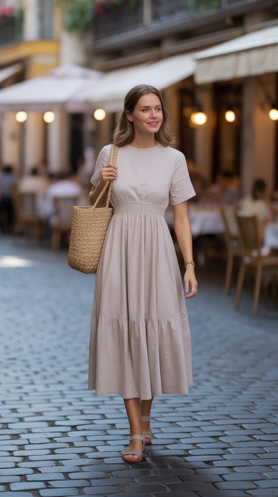 A knee-length beige linen-cotton midi dress with tiered ruffles, smocked waist, and clean Round-neckline. Styled with a woven straw tote, nude block-heel sandals, and delicate gold bangles. The model walks down a European street at dusk—café lights glowing softly behind her. The look is serene, grounded, and full of gentle sophistication—elegance that doesn’t demand attention, but commands it.
