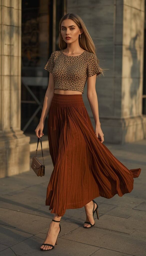 A cropped leopard-print top (taupe-and-black, short sleeves, fitted bodice) paired with a flowing rust-brown pleated midi skirt (high waist, side slit). Styled with black strappy heels, gold hoop earrings, and a metallic mini clutch. The model walks down a sun-drenched street—fabric catching light, hair in motion. Bold, joyful, and deeply intentional—wildness tamed with confidence.