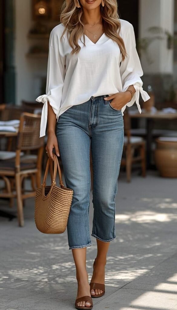 A flowing white silk blouse (V-neck, tie-sleeve detail) paired with cropped medium-wash denim jeans (raw hem, ankle-length), styled with tan leather slide sandals and a woven raffia tote. The model walks through a sun-dappled courtyard—café tables blurred behind her, hair catching light. The look is effortlessly chic, breathable, and deeply wearable—elegant without effort, casual without compromise.