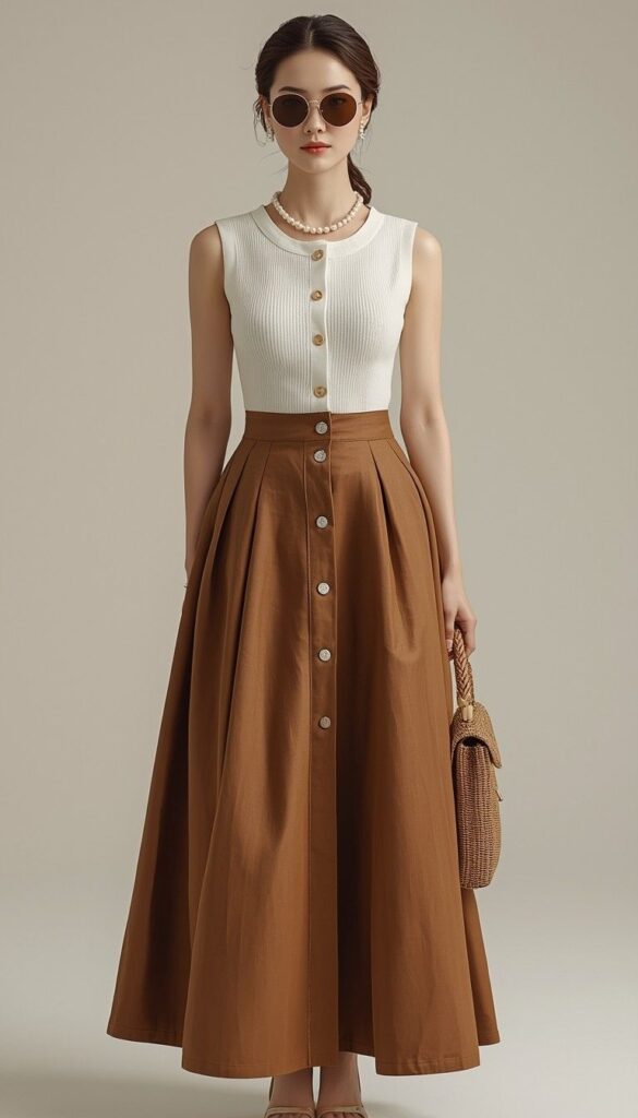 A sleeveless cream ribbed knit top (round neckline, gold-button front) paired with a full camel midi skirt featuring a central button placket and gentle A-line flare. Styled with pearl necklace, woven raffia clutch, and nude block heels. The model stands against a neutral backdrop—light catching the texture of the fabric. The silhouette is refined, timeless, and full of quiet grace—elegance that breathes with you.