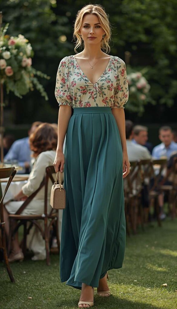 A knee-length ivory blouse with delicate pink-and-green floral print, puffed short sleeves, and a V-neckline—tucked into a flowing teal pleated midi skirt (high waist, clean hem). Styled with nude block-heel sandals, a gold chain necklace, and a small woven clutch. The model walks through a lush garden gathering—guests seated at tables behind her, roses blooming nearby. The palette is cool, harmonious, and full of gentle sophistication.