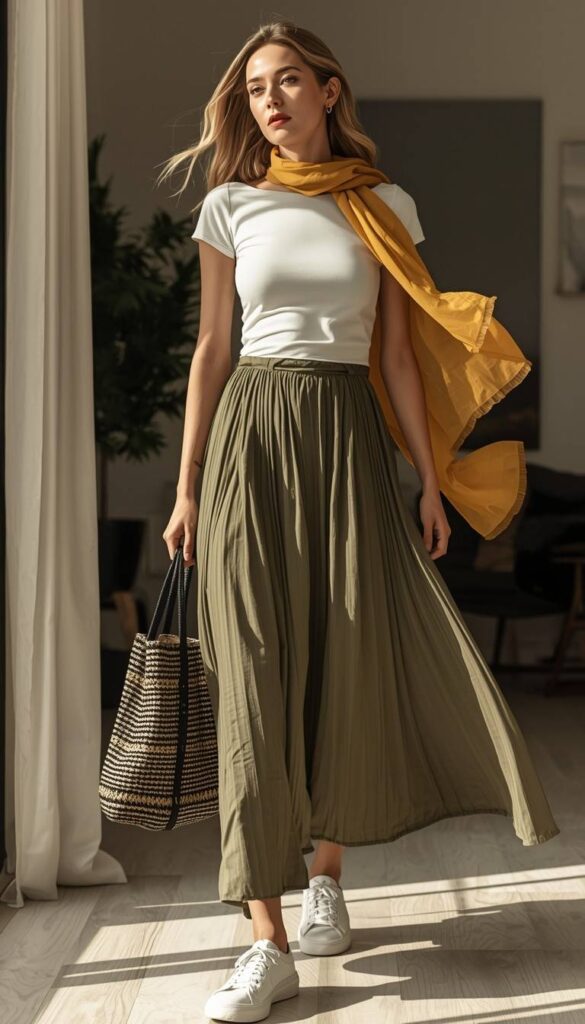 A crisp white short-sleeve tee tucked into high-waisted olive-green pleated wide-leg trousers (soft drape, side slit), layered with a flowing mustard-yellow silk scarf draped over one shoulder. Styled with white platform sneakers, a woven tote with geometric trim, and minimal jewelry. Sunlight streams through the window—the fabric catches light like warmth made visible. The look is grounded, fresh, and full of effortless charm.