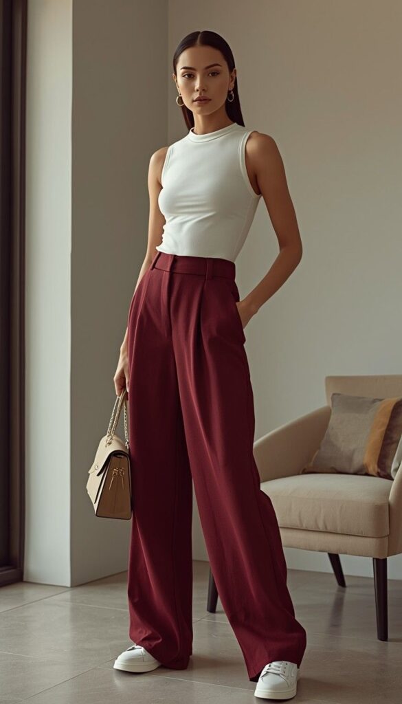 7) Bold Burgundy Wide-Leg Trousers & White Tank