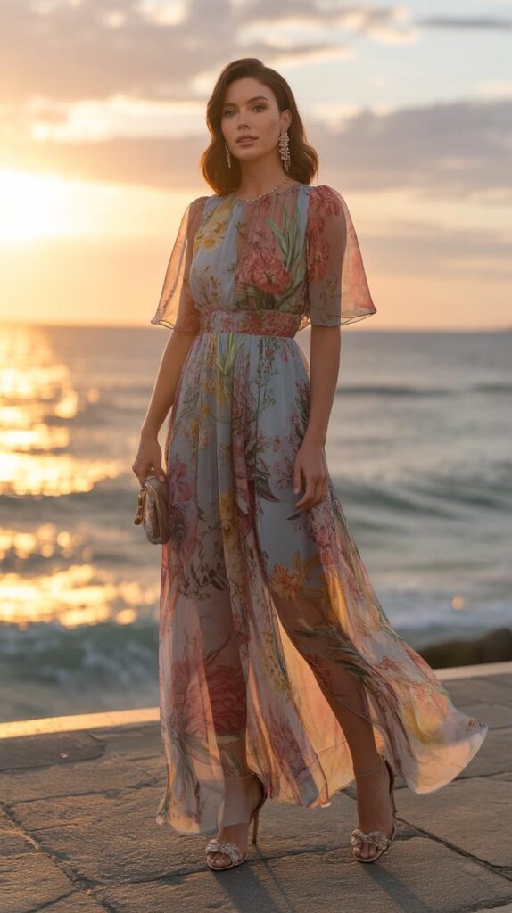 A floor-length sheer chiffon maxi dress in soft blue-grey base, adorned with oversized watercolor florals in coral, peach, and sage—flowing sleeves, V-neckline, and a subtle side slit. Paired with crystal-embellished strappy heels and a metallic clutch. The model stands on a stone promenade at golden hour, ocean behind her, sunlight glinting on the water. The dress moves like breath—light, poetic, and utterly captivating.