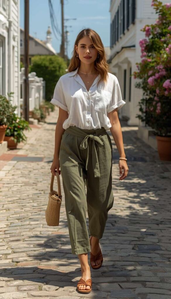 A soft sage-green linen short-sleeve shirt (notched collar, button-front) paired with matching high-waisted cropped wide-leg trousers (cuffed ankles, subtle texture), styled with tan leather slide sandals, a structured beige leather tote, and layered gold jewelry. The model walks down a sun-dappled historic street—brick sidewalks, wrought-iron lampposts, and ivy-covered brownstones behind her, expression serene and assured. The look is grounded, modern, and deeply wearable—Boston Common meets Martha’s Vineyard, distilled to its essence.