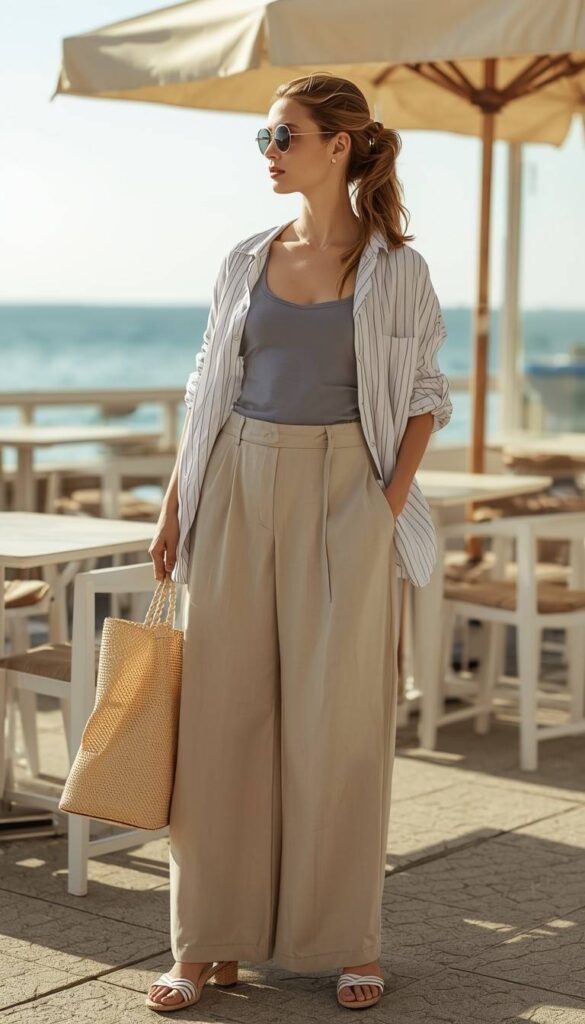 A light-blue-and-white vertically striped short-sleeve shirt (relaxed fit, rolled sleeves) worn open over a soft grey ribbed tank, paired with high-waisted beige wide-leg trousers (clean hem, subtle drape). Styled with tan block-heel sandals, a woven circular raffia tote, and oversized sunglasses. The model stands on a sunlit seaside patio—white tables, cream umbrellas, and turquoise water behind her, hair softly windswept. The look is breezy, intelligent, and deeply wearable—like a slow lunch in Provincetown or Sag Harbor.