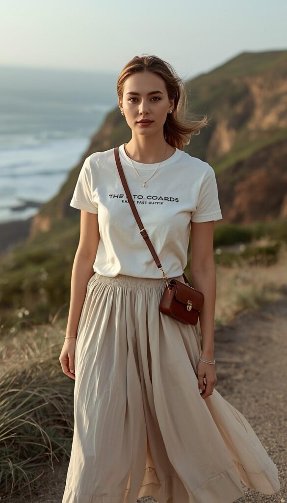 14) Graphic Tee & Flowing Midi Skirt on Coastal Cliff