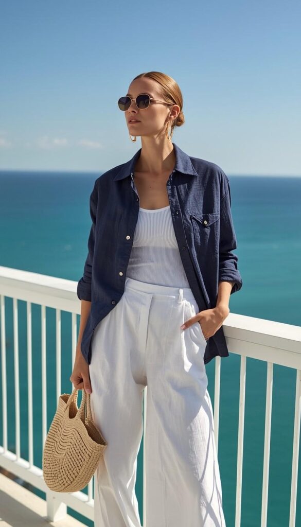 A short-sleeve navy-blue linen shirt (classic collar, chest pocket) tucked into high-waisted white wide-leg trousers (ankle-length, smooth texture), styled with tan flat sandals, a woven circular raffia tote, and oversized sunglasses. The model leans against a white railing overlooking turquoise water—sky clear, wind gentle, hair softly windswept. The palette is timeless East Coast: navy, ivory, and seafoam—elegant without effort, refined without rigidity.