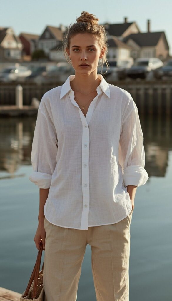 A crisp white linen shirtdress (short sleeves, chest pocket, V-neck) styled with the hem tied in a soft knot at the waist, paired with high-waisted beige tailored trousers (clean hem, subtle pleating). Styled with a wide-brimmed straw hat, tan leather slide sandals, layered gold necklaces, and a woven circular raffia tote. The model stands on a sun-drenched white balcony overlooking the ocean—breeze lifting the hem, expression calm and radiant. The silhouette is fluid, elongating, and deeply graceful—like a slow morning in Nantucket or Block Island.
