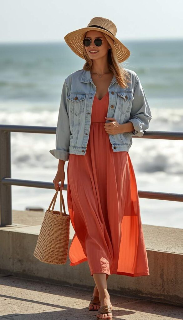 5) Denim Jacket & Coral Maxi Dress by the Sea